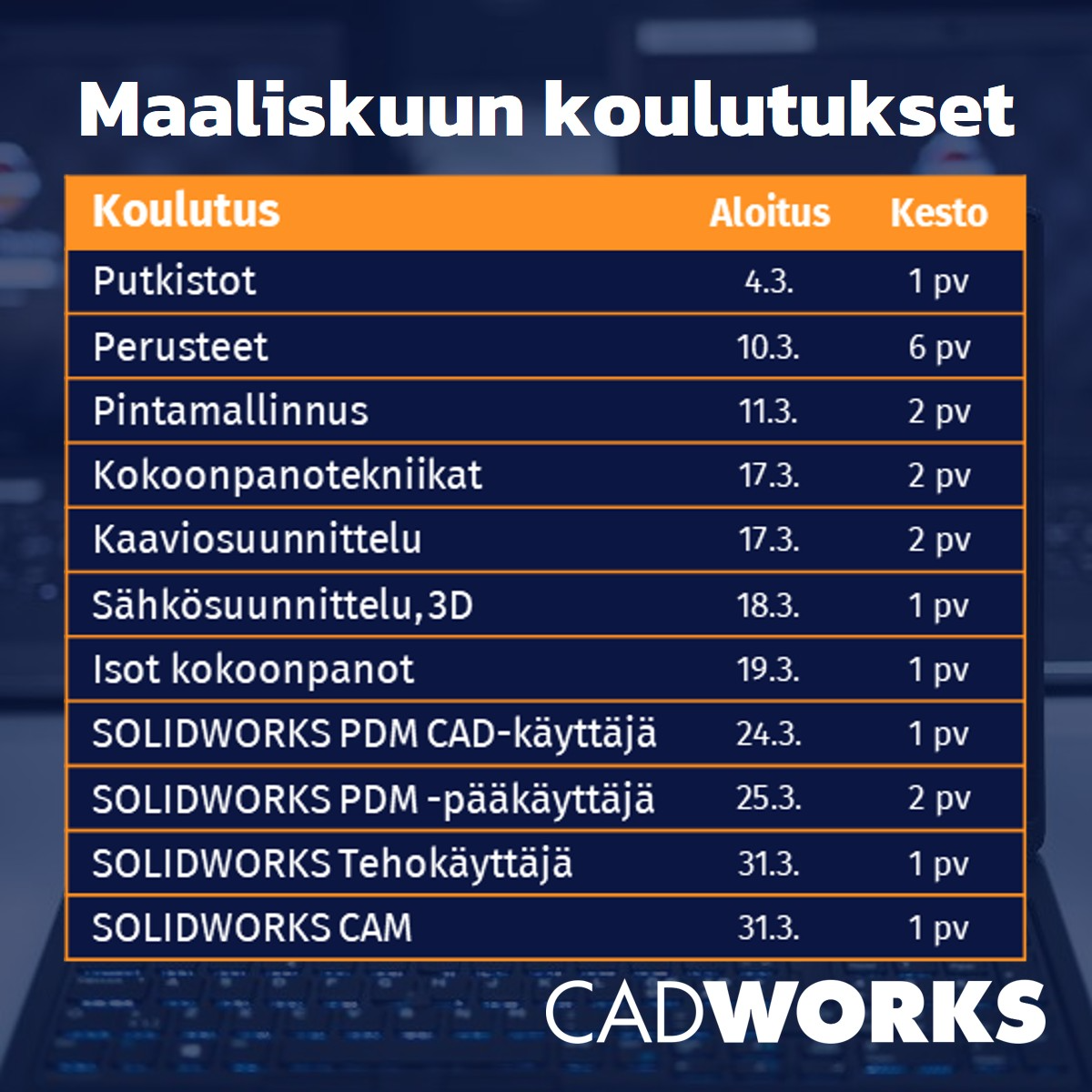 Kaikki maaliskuun koulutukset ovat online. Lisätiedot ja ilmoittautumiset koulutuskalenterista https://www.cadworks.fi/fi/koulutukset/.